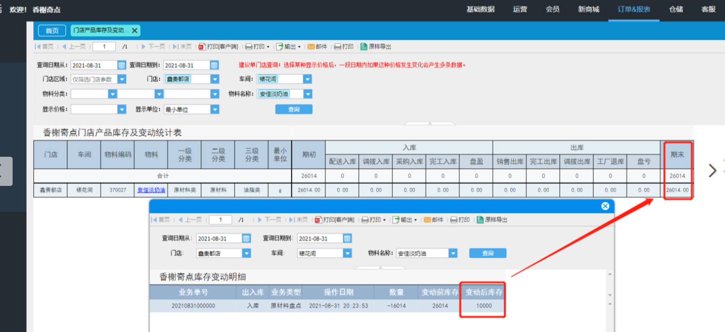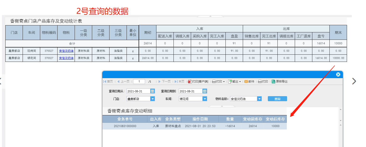 痛点:门店31日月底大盘,晚上上传完盘点数据后,看到上传完成,直接关机。实际库存变动数据还未上传至后台。隔日开机后月初1号才上传成功。则后台人员1号查“门店的库存变动统计表”数据就会如图1,显示的期末有问题,2号再查如图2,数据就会修正。企业对比两天的数据,还会以为数据有问题,有前后两天怎么对不上疑问。